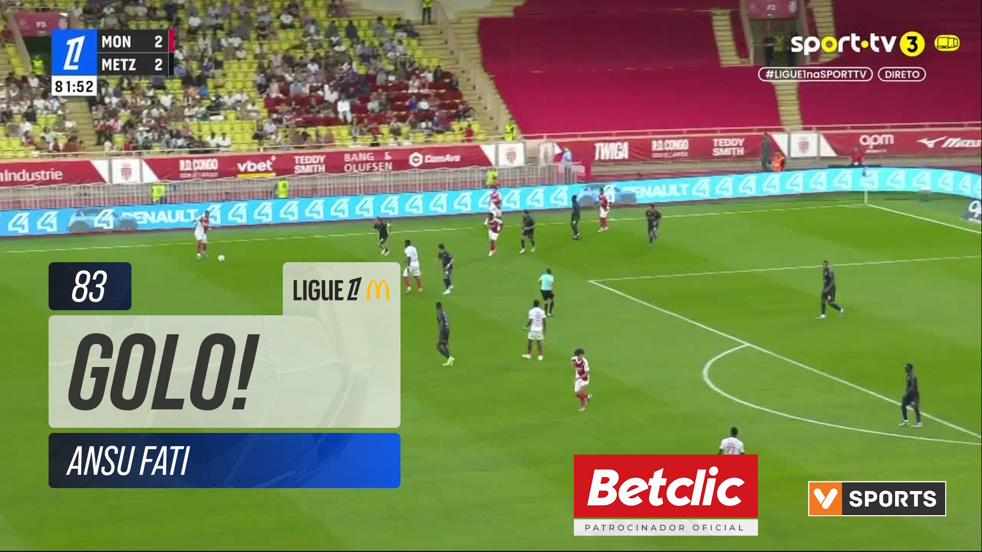 GOLO! Monaco, Ansu Fati aos 83', Monaco 3-2 Metz